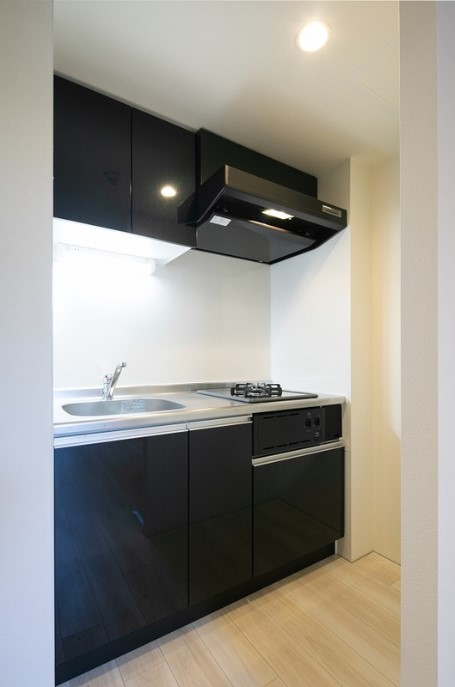 二面採光の角部屋は壁の一部がコンクリート打ちっ放しのお洒落な内装。インターネットが無料で楽しめ、2口ガスのシステムキッチンや追い炊き、浴室乾燥機、独立洗面台、温水洗浄便座、エアコン等の設備が充実